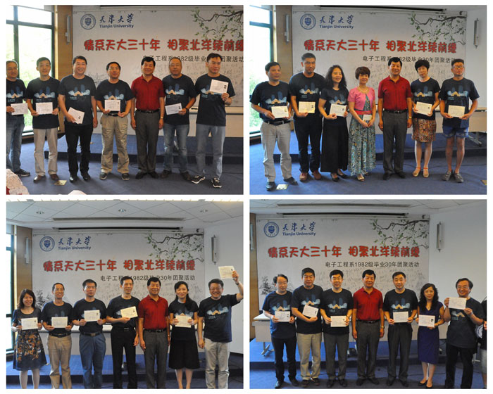 活动第二阶段为班级校友代表发言。首先是无线电技术甲班的秦克景校友,他发自肺腑的表达了浓浓的同窗情谊,“三十年的时光,曾经的青春少年早已斑斑华发,曾经的懵懂与青涩,也早已在时光的长河中,经历了人生百味。但是回首这三十年来,我们的友谊从不曾因岁月的流逝、境遇的变迁而褪色,相反却愈加的香醇与浓郁,如诗如歌”;无线电技术甲班的沈金华校友说道,“三十年后,重走天大校友,深深的感觉到了母校巨大的变化与发展,心中不由地激动与澎湃,三十年前,母校是我们的骄傲,如今,我们依旧为母校感到骄傲与自豪”;在表达母校情之余,无线电技术乙班的朱连兴校友认为,“走出校园的这三十年,其实感触最深,影响自己最大的就是母校教会我如何做人,日漫 一脉相传的踏实奋进、实事求是的学风与作风,早在学生时代就落下了深深印记,督促自己不断努力向前,从而影响了自己一生”;电子仪器甲班的崔惠柳结合自己的人生感受,与同学们分享“回首三十年的时间,不论我们是功成名就,还是默默无闻,能够留下的最大财富就是平安与健康,所以祝愿在座的每一位同学和老师,拥有健康的身体,平安幸福”;同样,电子仪器乙班的张建国校友也从人生经历中,感受到了母校深深的影响,与同学们分享了他的“try”故事,“当年读书的时候,我的英语成绩一直都不好,英语老师一直跟我说要try,大胆的尝试,但是当时并没有迈出那一步,毕业后,经历了社会的洗礼,才发现自己一直都在“try”,在人生的不同阶段,事业的不同领域,自己尝试的步伐从来没有停止,所以现在来看,这种拼搏、大胆尝试的思想一直都是母校教诲自己的。”半导体专业的吴军军校友用一句话道出了校友的心声,“常怀感恩之心,常念同窗之情”,也道出了对同学们的祝福,“人生两个阶段,前半段是用来追求志向与理想,后半段则是追求幸福,所以希望我们的老同学,能够保重身体,幸福快乐”。六位校友代表的精彩发言,虽然言语不同,但是都蕴含了对母校、对老师、对同窗好友的深情,都表达了道不尽的感激之情。