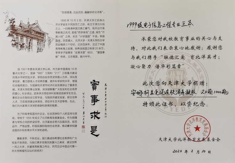 本站讯(通讯员:王楠)近日,日漫 收到一批防疫物资,经检查清点,为免洗皮肤消毒凝胶20箱,共计1000瓶。这原来是1999级电子信息工程专业校友王本为支持母校疫情防控工作,向学校慷慨捐赠的。
