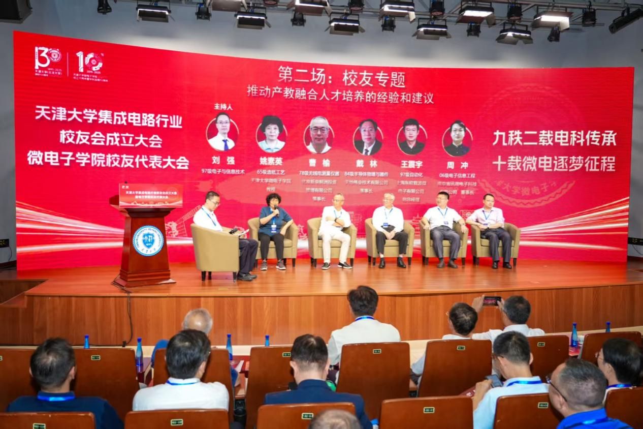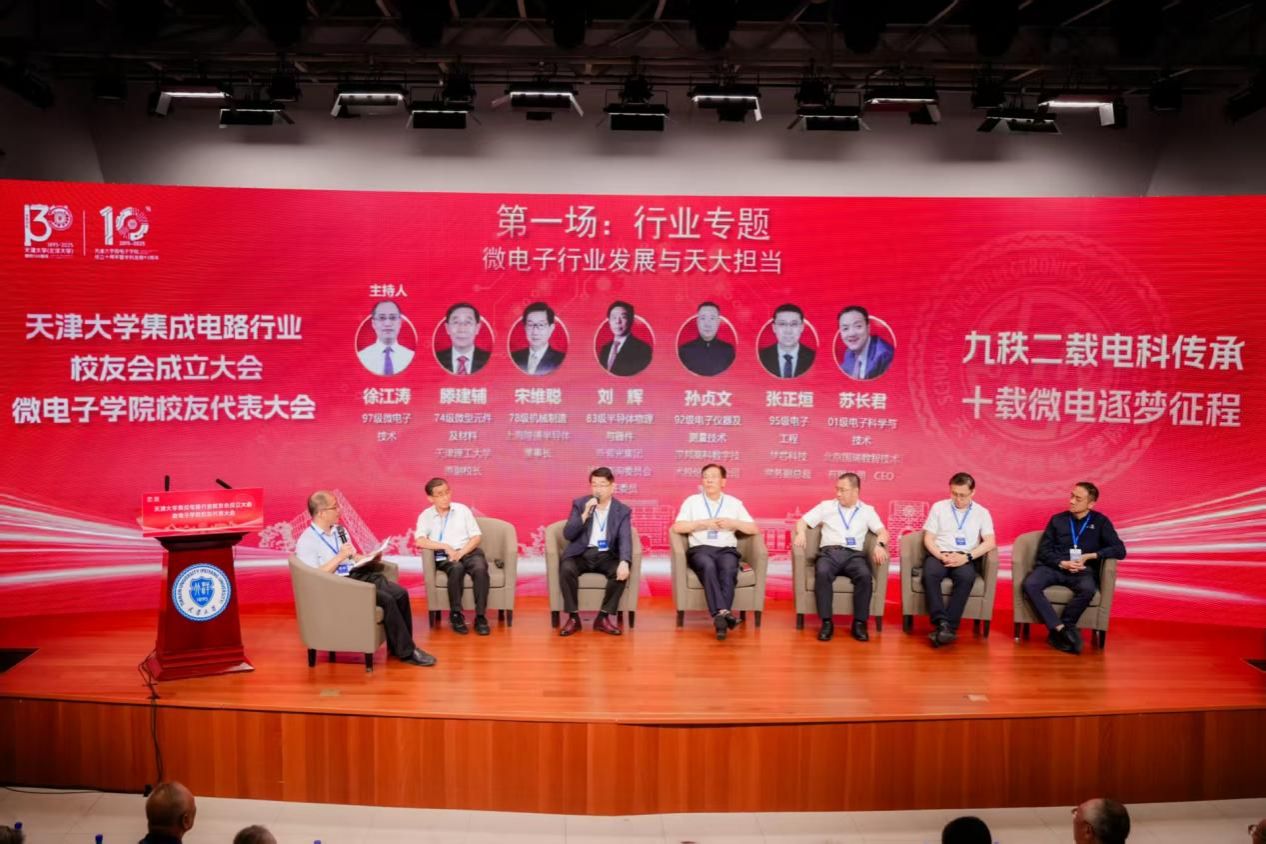 集成电路行业发展得到了行业校友的积极关注与大力支持,天津理工大学原副校长滕建辅、上海陛通半导体董事长宋维聪、新紫光集团战略咨询委员会主任委员刘辉、汉邦高科技数字技术股份有限公司董事孙贞文、梦芯科技常务副总裁张正烜、北京国瑞数智技术有限公司CEO苏长君等6位行业校友围绕“微电子行业发展与天大担当”开展交流讨论,由日漫 教授徐江涛主持。