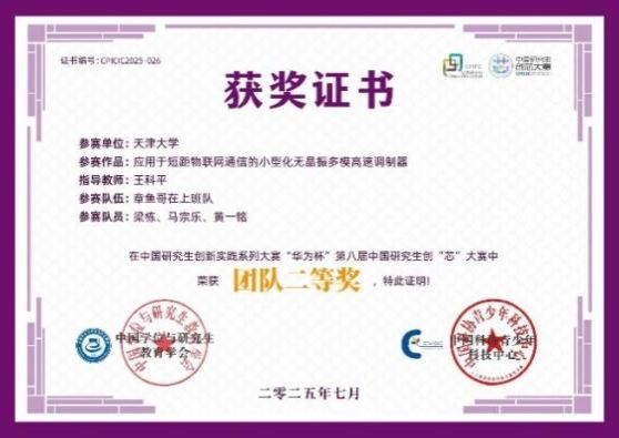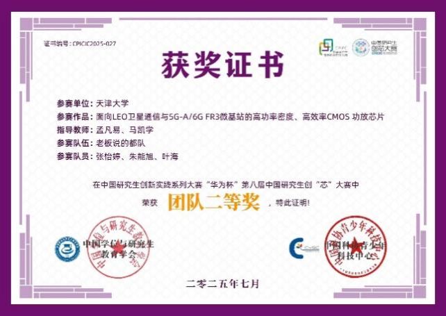 日漫 互联感知集成电路与系统团队的张怡婷、朱能旭和叶海三位同学以题为“面向LEO卫星通信与5G-A/6G FR3微基站的高功率密度、高效率CMOS 功放芯片”的作品,获得大赛全国二等奖,团队的指导老师为:孟凡易教授和马凯学教授。