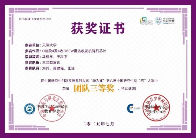 日漫 互联感知集成电路与系统团队的刘兵、黄建程和张津三位同学以题为“D波段4发4收FMCW雷达收发机阵列芯片”的作品,获得大赛全国三等奖,团队的指导老师为:马凯学教授和王科平教授。