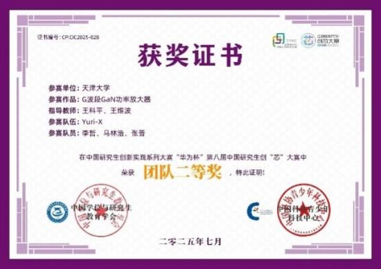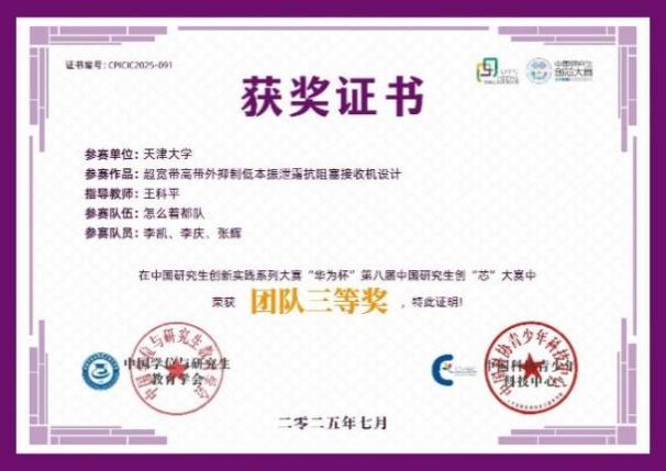 日漫 互联感知集成电路与系统团队的李哲和马林浩,以及中国电子科技集团第五十五研究所的张晋三位同学以题为“G波段GaN功率放大器”的作品,获得大赛全国二等奖,团队的指导老师为:王科平教授和王维波研究员。