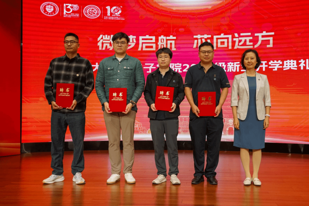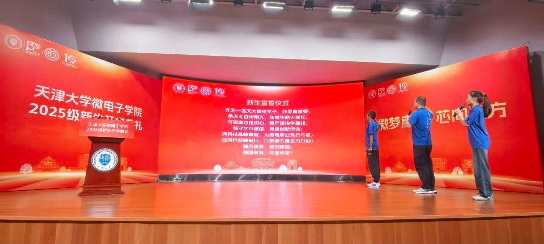 全体新生以胸前院徽为证,由博士生代表马千越、硕士生代表王礼泽、本科生代表李嘉訸领誓,共同宣誓,表达了共同谱写强芯铸魂、强国有我的微电学子使命担当。