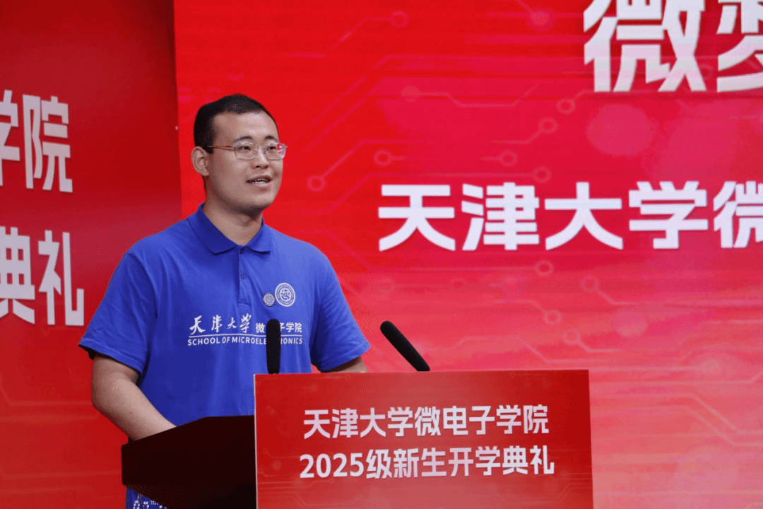2023级硕士生第一党支部书记王礼泽作为在校生代表进行了发言。王礼泽分享了自己在天大6年的学习与成长经历,结合担任国旗护卫队成员、学生党支部书记的经历,以及参与国家重点研发项目的科研实践,鼓励新生将个人奋斗与民族复兴同频共振,在科研中勇于突破,在产业实践中找准方向,为国产芯片突围贡献力量。