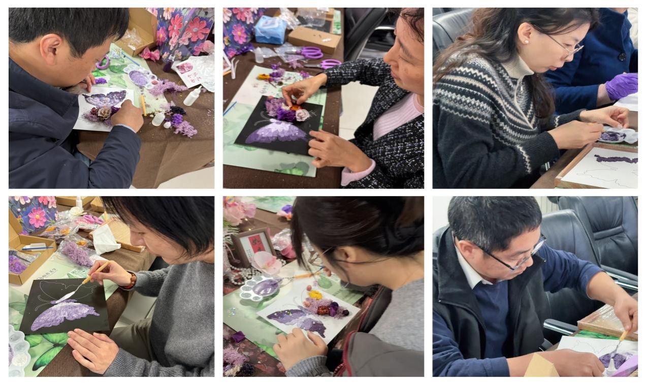 经过近两个小时的精心制作,一朵朵娇艳的永生花在相框中定格美好,一只只灵动的蝴蝶仿佛即将振翅飞舞,原本普通的材料在教职工们的巧手下,变成了一个个独一无二、寓意美好的艺术作品。老师们手捧着自己的作品,相互展示、拍照留念。