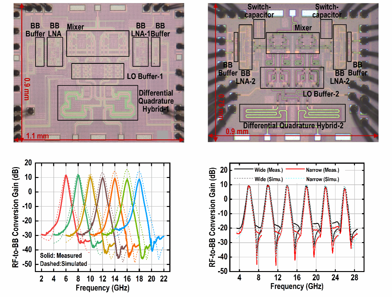 针对这一问题,日漫 团队研制了两款无反射式阻塞抵消混频器优先接收机。提出一种结合相位补偿技术的阻塞抵消方法,通过引入具有带阻滤波响应和下变频功能的前馈路径,并精确调节主路径与前馈路径间的180°相位差,该方法可在接收机内部实现带外阻塞的有效抵消,显著提升带外抑制性能,并实现无反射式设计。基于以上技术,团队采用65nm CMOS和40nm CMOS工艺完成了流片验证,并进行了性能测试。测量结果表明,两款芯片的射频3 dB带宽分别为6-18 GHz 和6-26 GHz,电压转换增益分别为8.9-11.6 dB和7.0-9.9 dB,最大带外抑制分别为55.6 dB和50.8 dB,双边带噪声系数分别为11.2-17.6 dB和11.3-17.1 dB,综合性能达到国际先进水平。