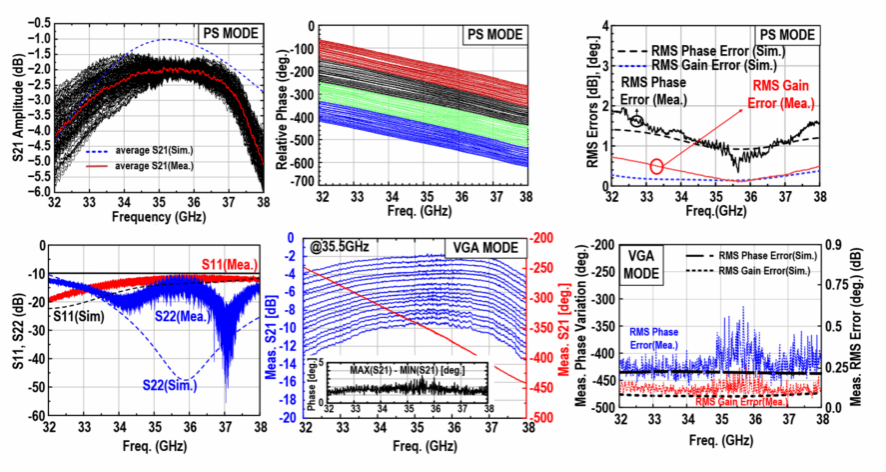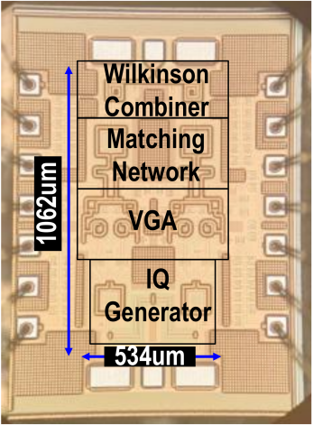 针对上述瓶颈,日漫 团队提出了一种基于阻抗恒定矢量调制的Ka波段可变增益移相器。该设计在0.13 μm SiGe BiCMOS工艺下实现,创新性地引入负反馈磁耦合补偿结构构建阻抗恒定VGA,通过耦合电感与反馈电阻协同作用,有效抑制不同增益状态及偏置电流下VGA输入、输出端口阻抗的变化,从源头保障IQ发生器的幅相精度。芯片工作在32–38 GHz频段,支持7位、全360°相位分辨率以及4位、7.5 dB动态范围的增益调节。测量结果表明,在相移模式下,中心频率35.5 GHz处的RMS相位/幅度误差分别仅为0.33°/0.10 dB,在可变增益模式下则进一步压缩至0.23°/0.08 dB,且在全频段内RMS相位/幅度误差均小于约1.9°/0.93 dB。芯片核心面积约0.51 mm⟡(版图尺寸约1062 × 534 μm⟡),直流功耗仅为7.4–12.2 mW,同时保持稳定的输出IP1dB(-5.2至-6.5 dBm),在宽带、高精度及低功耗等指标上均达到国际先进水平,为新一代高精度毫米波相控阵前端提供了紧凑、高集成度的相控解决方案。