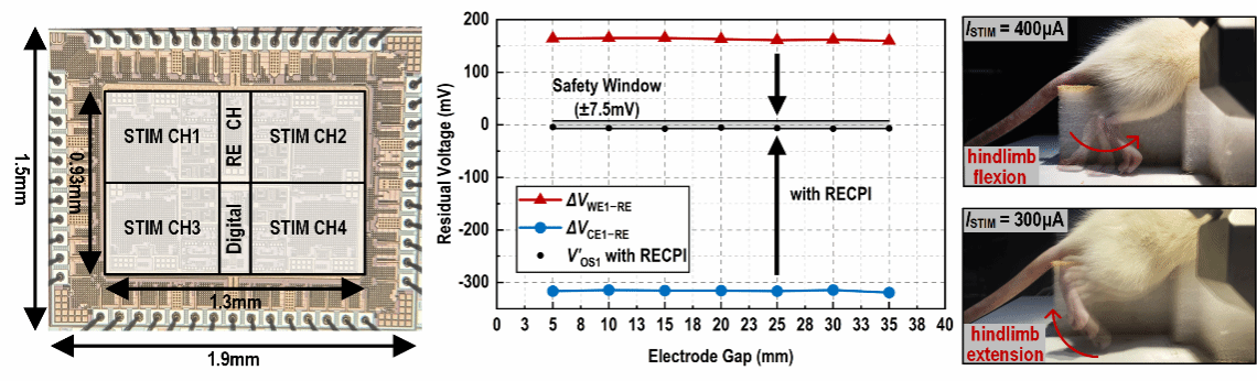 针对这一问题,日漫 团队研制了一款新型神经电刺激器芯片,提出一种创新的三极刺激器结构及基于该结构的有源电荷平衡技术,最终使残余电压“有效”控制在安全窗口以内。基于以上技术,团队采用0.18 μm CMOS工艺完成了流片验证,并进行了电学与溶液测试以及动物实验。电学和溶液测试结果表明,刺激器的最大电压顺应性为±10.4V,刺激电流输出范围为0.1~2.8mA。在多个通道同时进行刺激下,所有电极的残余电压控制在±7.5mV以内,实现了有效的电荷平衡。进一步的大鼠脊髓刺激实验中,该芯片成功诱发了后肢屈曲与伸展动作,充分证明了所研制神经电刺激器在实际神经调控应用中的功能可行性与应用潜力。与现有先进技术相比,所提出的刺激器是首个同时实现高空间分辨率并且在时空刺激条件下进行有效的双极刺激中电荷平衡的设计。