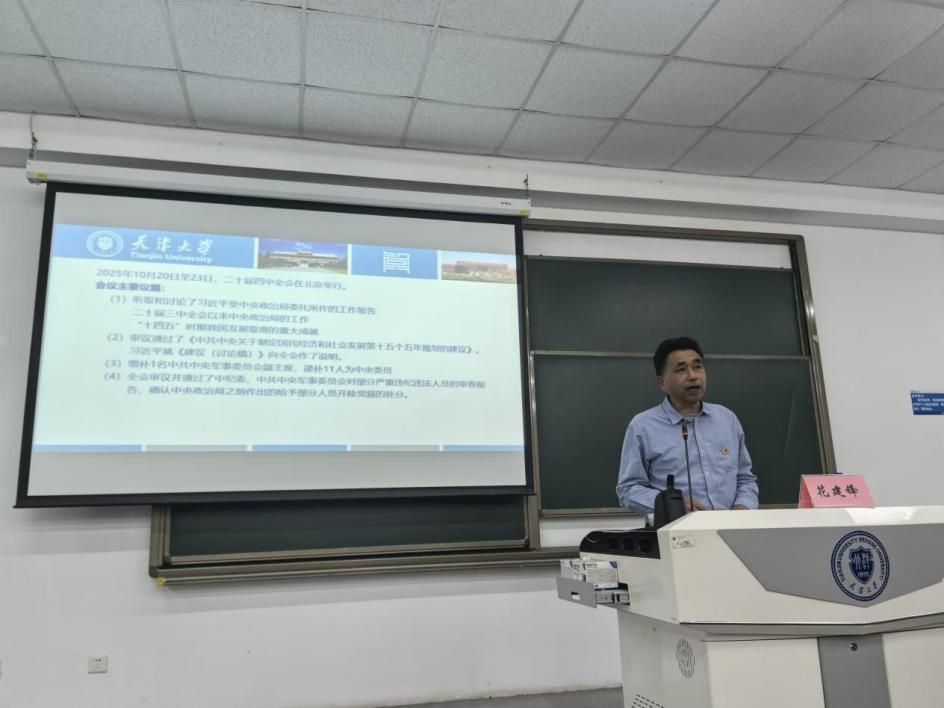 花建锋作题为《学习四中全会精神、把握规划建议要义》的专题辅导报告,从“十五五”规划建议的主要内容、“十三五”规划以来的发展脉络、把握“十五五”规划要义的思考系统阐述了新时代新阶段国家发展的战略导向、核心任务与实践路径,深入解读了规划建议中关于科技创新、人才培养、教育强国建设等关键部署的深层逻辑,清晰梳理了从 “十三五” 夯基垒台、“十四五” 提质增效到 “十五五” 谋篇布局的发展演进,为学院师生党员精准把握国家发展大局提供指引。