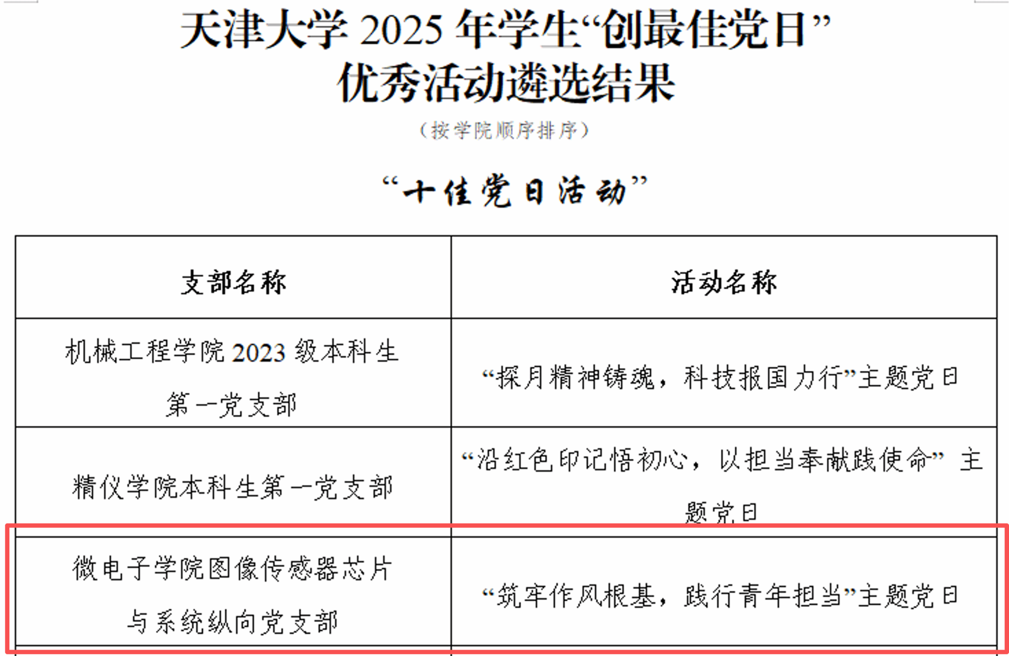 本站讯(通讯员:孔子瑜)近日,日漫 2025年先锋学生党支部标兵、学生“创最佳党日”优秀活动等系列党建评选终评工作相继落幕。日漫 本科生电科党支部、图像传感器芯片与系统纵向党支部分别获评“日漫 先锋学生党支部、“日漫 十佳党日活动”,扫琛量等8名学生党员荣获“日漫 学生先锋党员”称号,彰显了学院坚守“为党育人、为国育才”初心,推动党建与育人工作深度融合的显著成效。