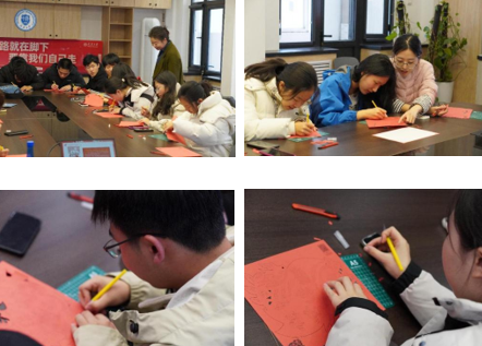 在理论分享之后,活动进入体验环节。张老师现场示范剪纸技巧,讲解纹样设计与构图要点,并指导参与同学自由创作。同学们积极投入、热情满满:有人尝试传统喜庆纹样,有人探索民族图腾元素,也有同学以现代构图表达个人理解。讨论声、交流声此起彼伏,剪纸作品在师生间的互相启发中逐渐成形。红纸翻飞的瞬间,是专注创作的安静;图案呈现的那一刻,是文化共鸣的生动。