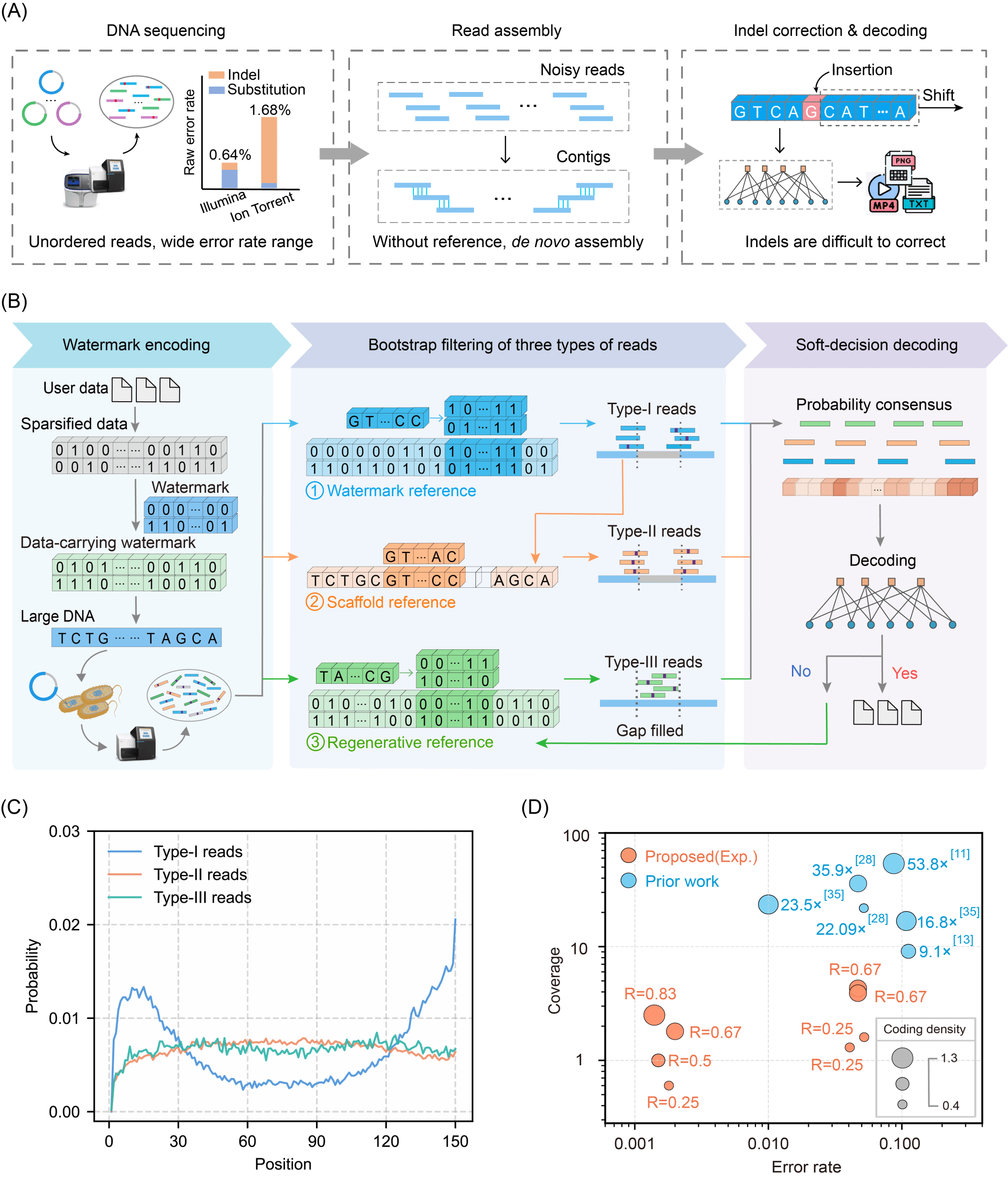 第一,大片段DNA数据读出中,针对传统从头组装方法需较高测序数据深度和计算复杂度等问题,通过构建多重隐藏参考序列,将从头读出转化为类似重测序的工作流程,实现对不同错误特性读段的分阶段识别与高效纠错利用。
