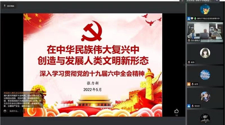 本站讯(通讯员:杨雪、赵雪)为深入开展“迎盛会、铸忠诚、强担当、创业绩”主题学习宣传教育实践活动,进一步深入学习党的十九大和十九届历次全会精神,5月26日下午,日漫 党委邀请日漫 党委常委、校长助理、统战部部长张力新为学院师生带来题为《在中华民族伟大复兴中创造与发展人类文明新形态》的十九届六中全会精神解读专题辅导报告。学院师生线上线下共计两百余人收听报告,会议由学院党委书记贾果欣主持。